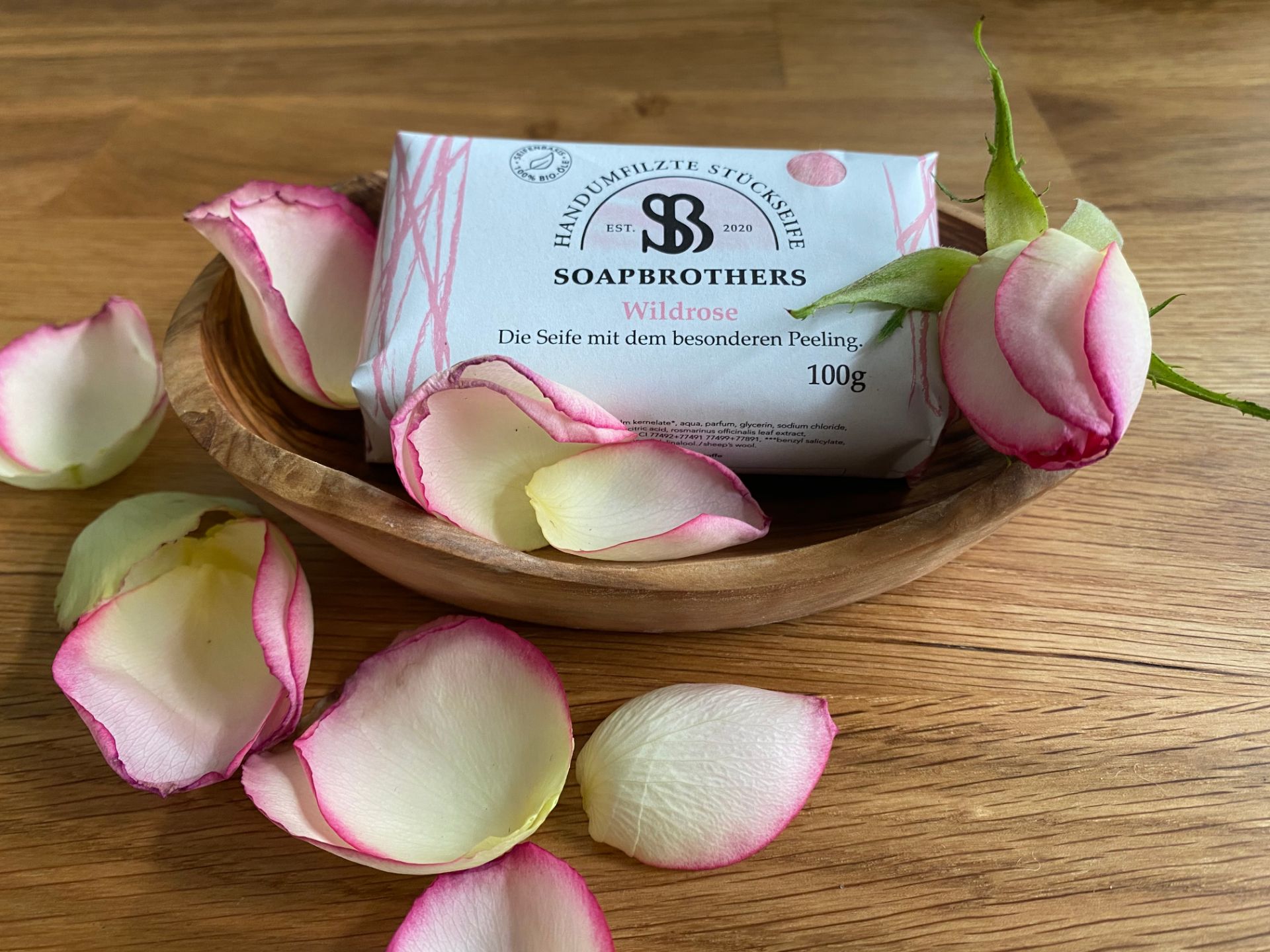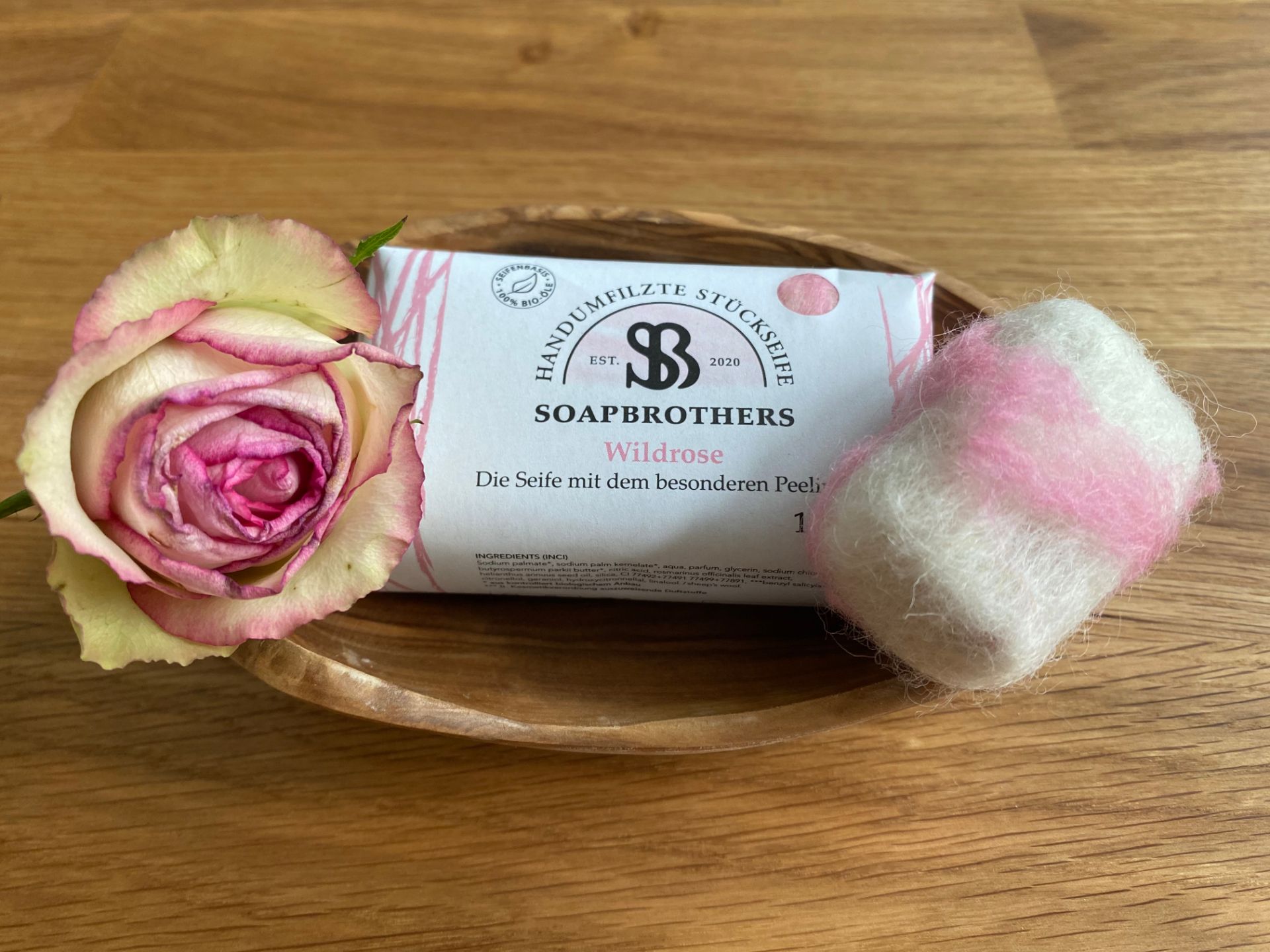 Naturkosmetik Bioseife mit Filzmantel in nachhaltiger Verpackung - Filzseife - Wildrose 100g - Gesch